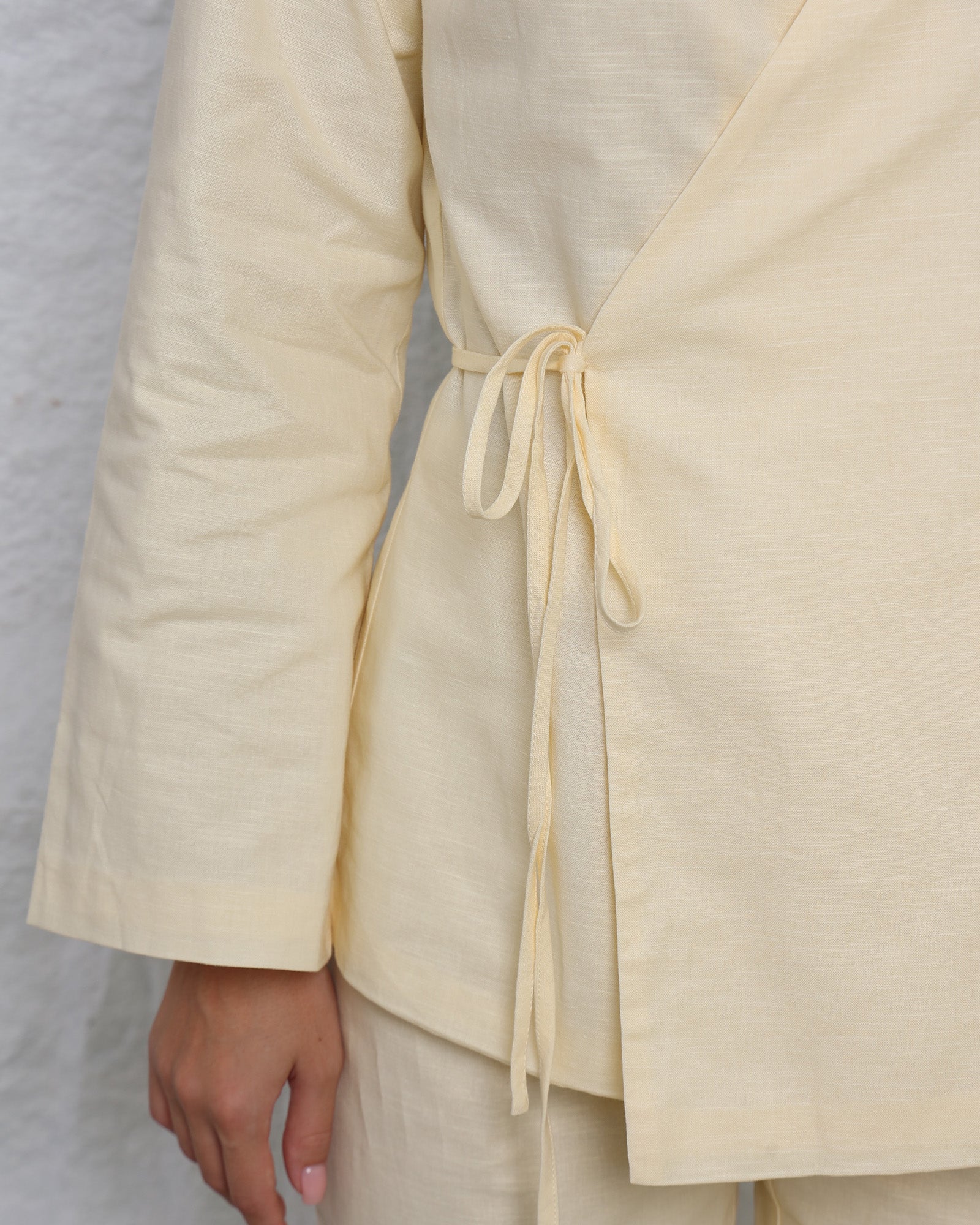 Wrap shirt made of a cotton hemp blend fabric. Long sleeves with slit. Matching garment available. Includes belt. This garment is part of a co ord.